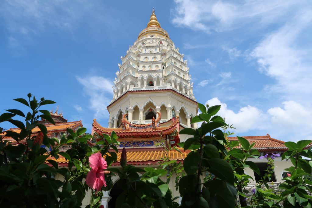 Een andere dag, een andere tempel. We huren opnieuw een scooter en rijden naar de Kek Lok Si Temple. Bordjes zijn niet nodig want we zien het complex al van ver glinsteren in de zon. Wow! We parkeren de scooter vanonder aan de berg en wandelen naar boven langs de verschillende tempels. De combinatie van de zengende hitte en de trappen is moordend. Maar hoe hoger we komen, hoe mooier de tempels zijn. Het absolute hoogtepunt is een beeld van Guanyin boven op de berg.