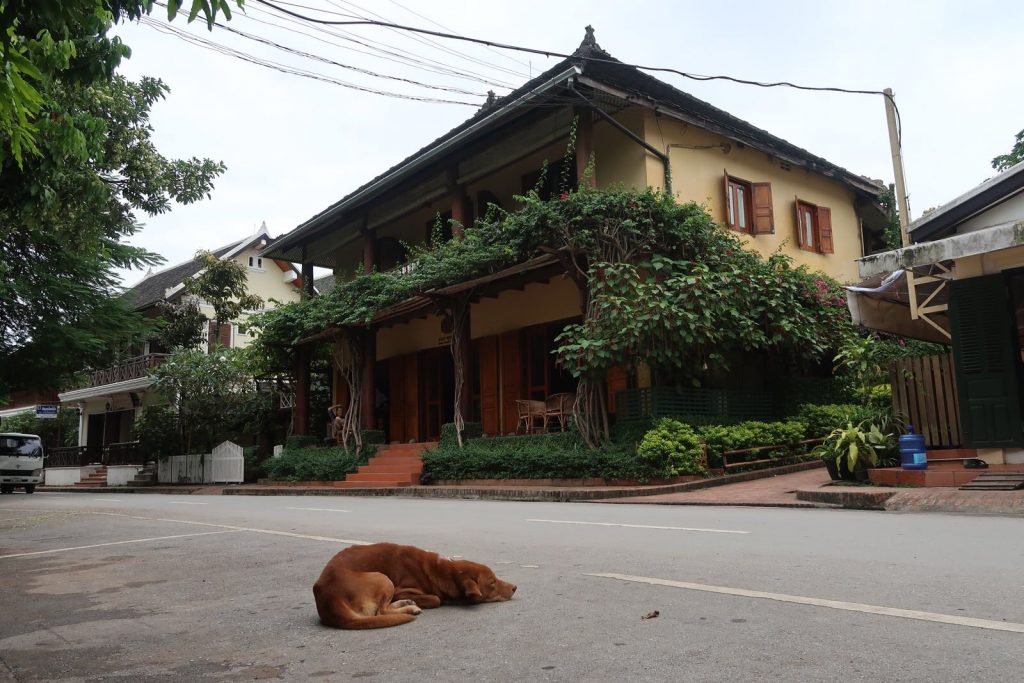 Laos is het eerste land waar we een visum moeten kopen on-the-spot. Al tien maanden lopen we rond met pasfoto’s en Amerikaanse dollars. Deze kunnen we nu gebruiken. Het hele proces verloopt vrij vlot en we worden met de taxi naar ons hotel gebracht. Door de Franse kolonisatie van Laos zijn er nog heel wat Franse elementen terug te zien in Luang Prabang. Het hotel is een gebouw met veel karakter en duidelijk Franse invloeden. Na check-in steken we per boot de rivier over en gaan op zoek naar avondeten. We schrikken behoorlijk van de prijzen. Wie heeft gezegd dat Laos een goedkoop land is?