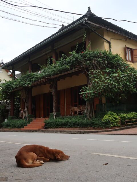 Vorige week hebben we zo goed als alles in Luang Prabang al gezien. Twee busritten op twee dagen is een beetje teveel van het goede dus we blijven nog een nacht in Luang Prabang. Luang Prabang is wel een fotogeniek dorp (of moet ik zeggen stad?) en we maken nog eens een wandeling langs de mooie gebouwen. Verder regelen we bustickets voor de bus van morgen. Het belooft een lange rit te worden en dus willen we nu echt wel tickets voor een normale bus. We maken duidelijk aan de man van het kantoor dat we niet in een mini-van willen zitten en hij lijkt het te begrijpen. Op het ticket staan twee zetelnummers, dit is een goed teken.